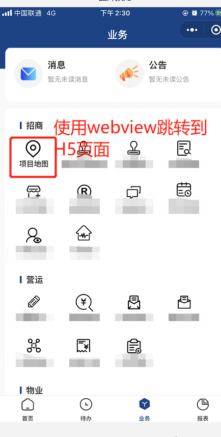 2、进入小程序的“业务”模块,点击“项目地图”进入项目地图的H5页面;