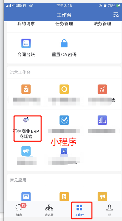 1、入口:在企业微信的“工作台”中的ERP商场端小程序;
