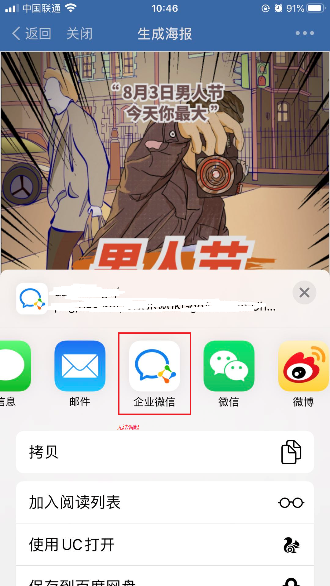 图片是前端使用canvas生成的,将图片转换成base64格式,然后处理成网络地址(https://oss1.chedianai.com/test/images/other/15966948156736.png?imageMogr2/auto-orient), 使用img标签展示, 长按图片,ios端无法调起分享到企业微信好友列表