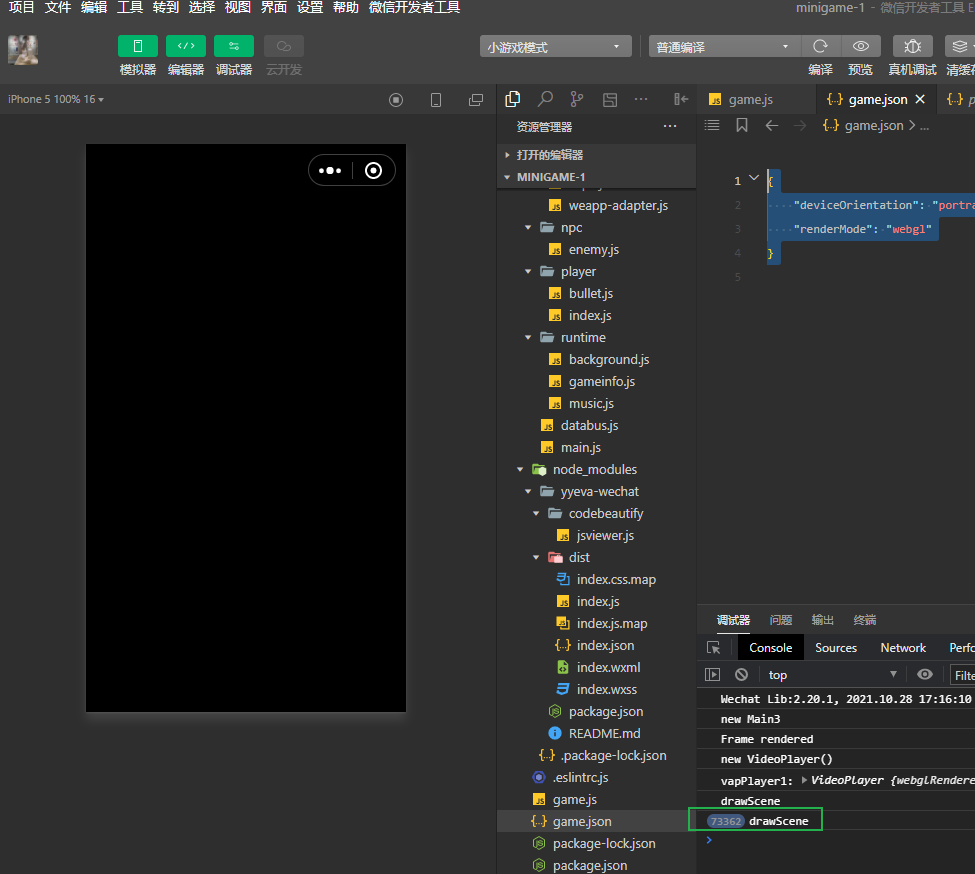 以上是测试代码,写在game.js中,game.json内容如下 {