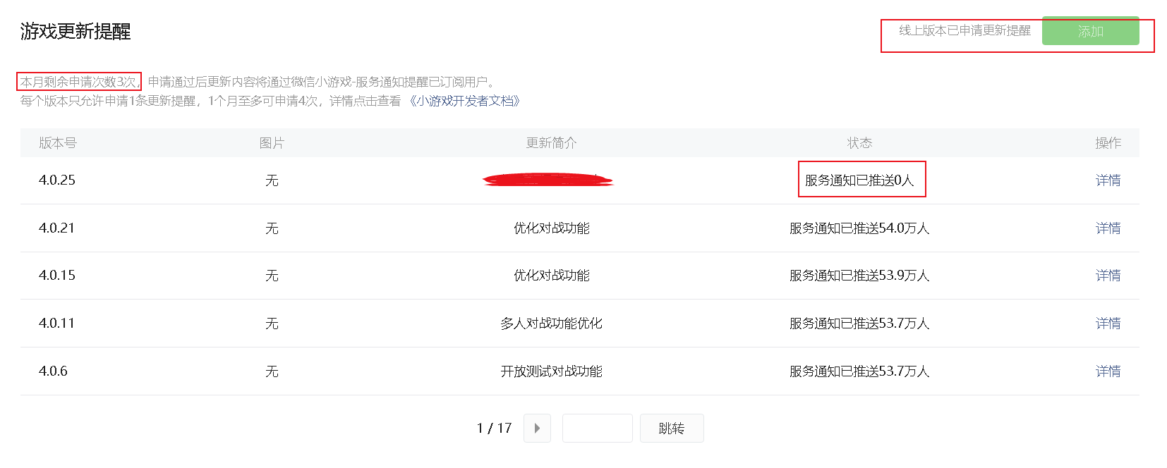 您好,游戏更新提醒审核通过,服务推送0人,也不能添加新的更新提醒,已经几天了,请问是怎么回事?