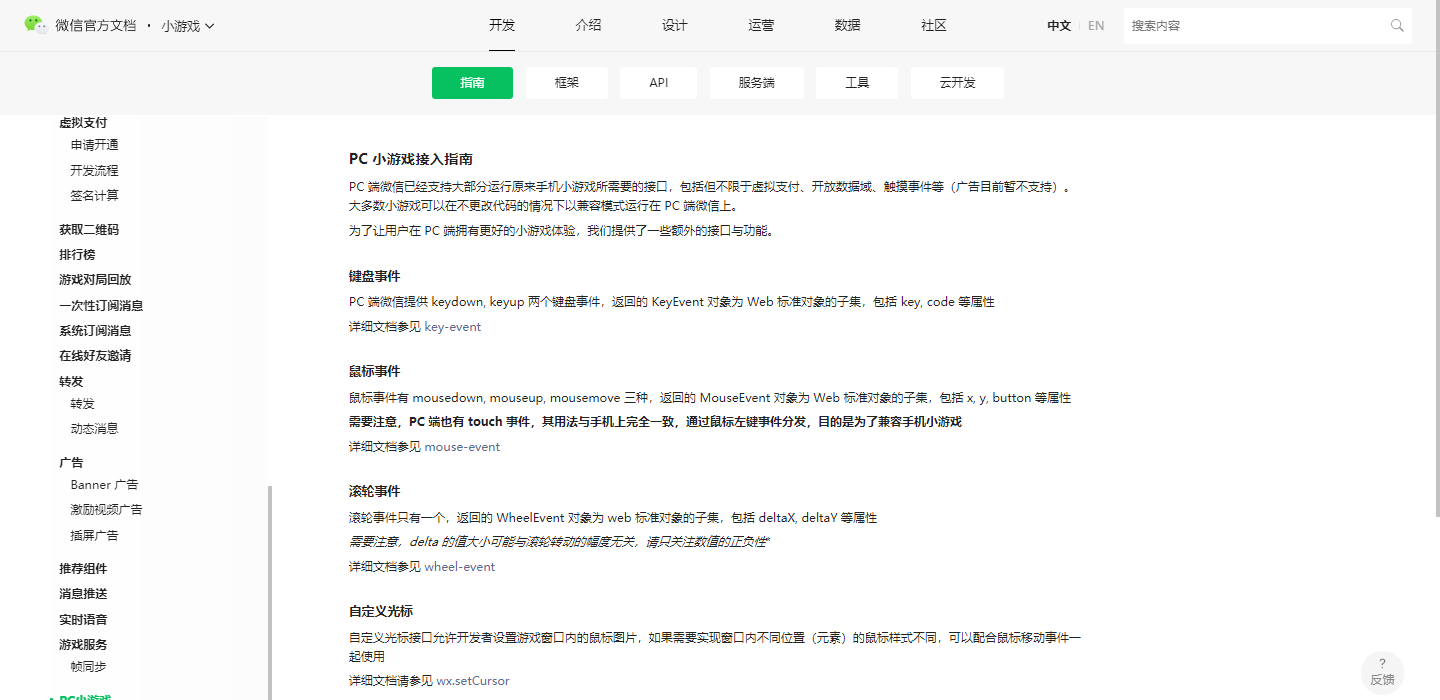 而如果你想要进一步了解某个新能力,比如平台刚刚开放测试的「PC小游戏」能力,只需轻轻一点即可一键直达该能力的详细开发文档。
