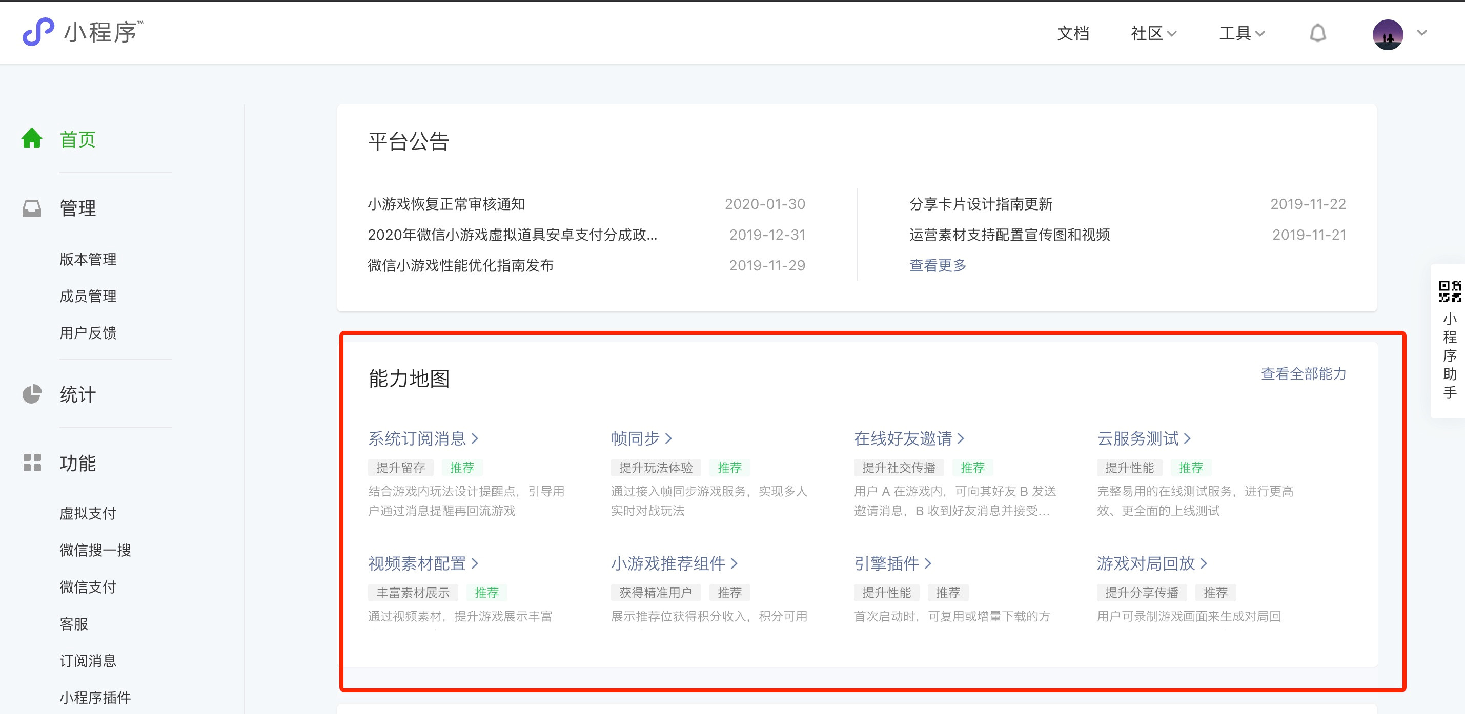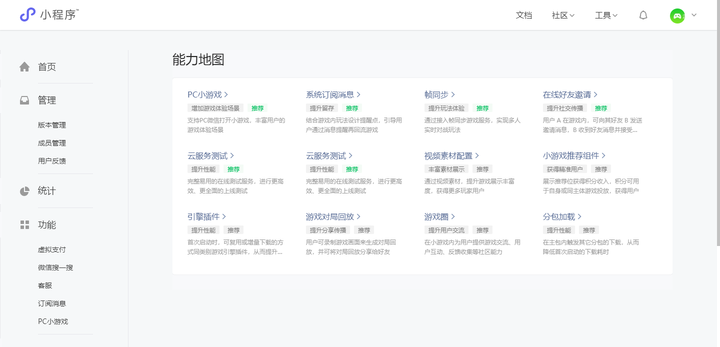 「能力地图」版块将最新最常用的小游戏能力融合在新版块中展示,如「PC小游戏」、「系统订阅消息」、「帧同步」等各种硬核能力及其简介一目了然。