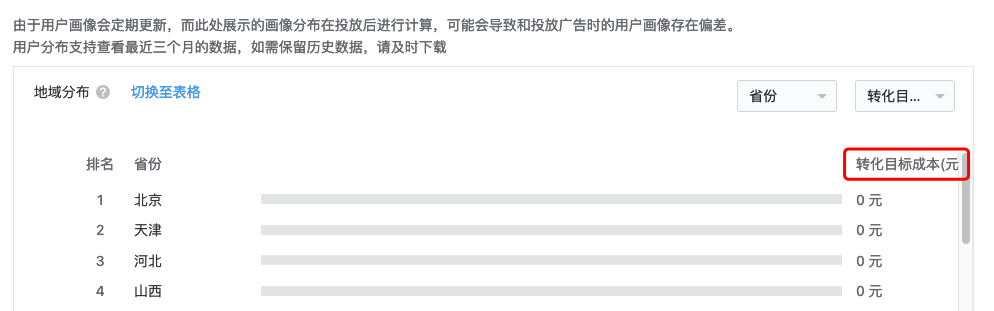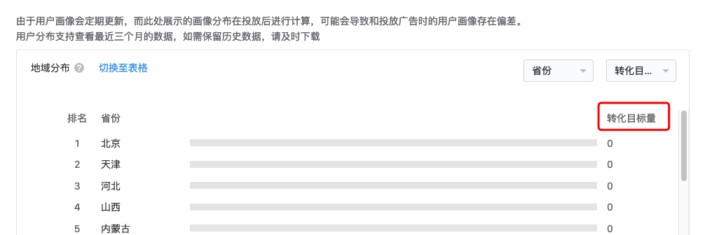 受众分布有部分优化目标的转化指标没有纳入统计,该功能后续会优化