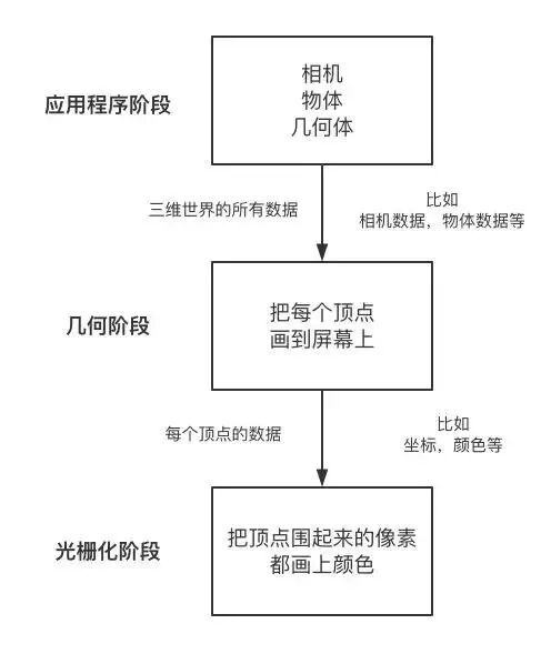 如何用图形渲染管线解决上述问题? 画一个三维物体到二维平面可以分为三个阶段: ●“准备数据” (应用程序阶段) ●“画点” (几何阶段) ●“画像素” (光栅化阶段)