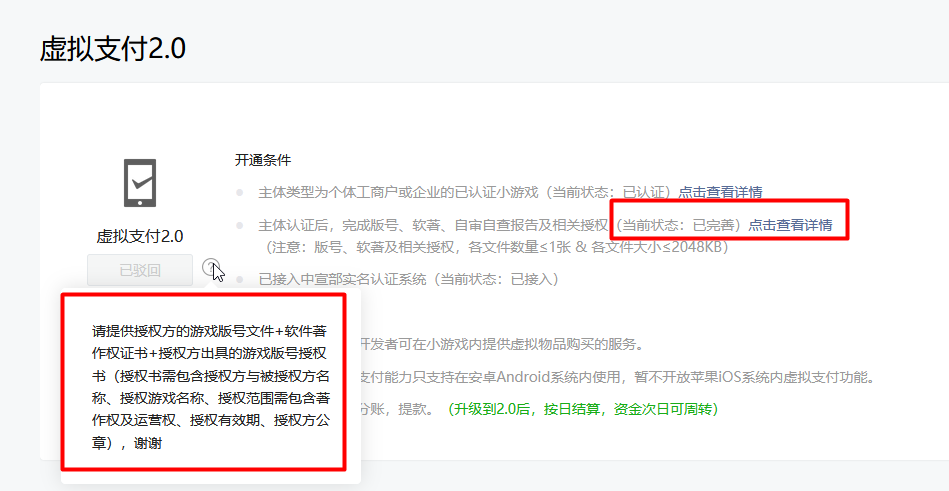 《火柴人快打》在资质已完善的情况下,申请开通虚拟支付,然后被驳回,说需要提供 版号文件+软著+授权书(如截图)。
