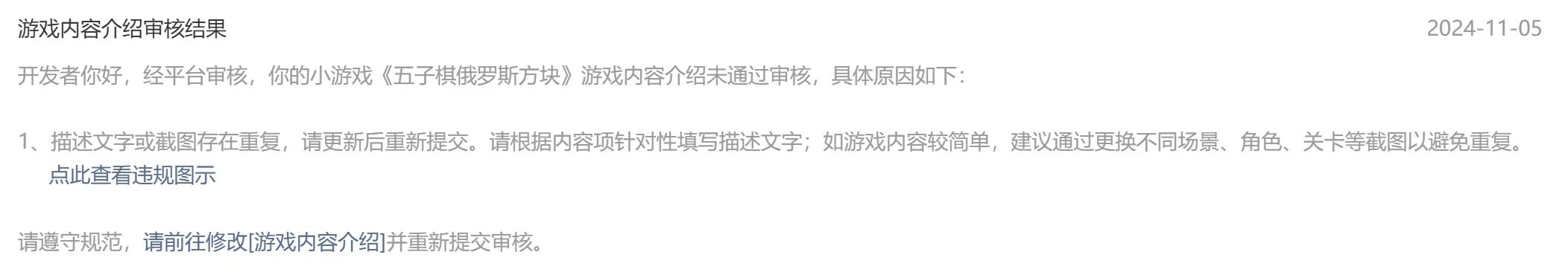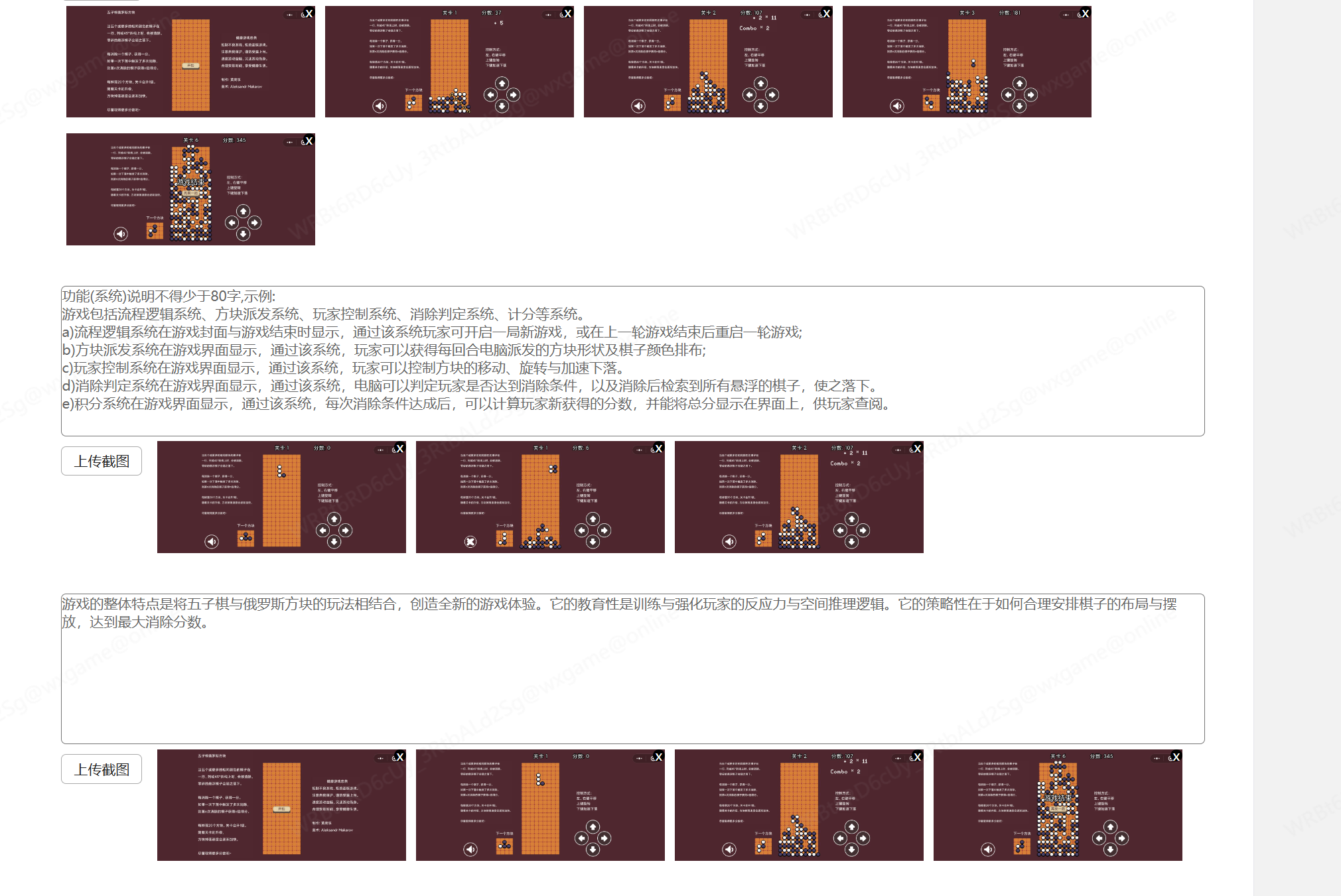 你好,我的《五子棋俄罗斯方块》游戏是将之前的steam同名游戏移植到微信小游戏上的,但是由于游戏的场景比较少,只有一个主场景,在游戏内容介绍审核时被卡。我现在是总共有7张截图,每个选项上传的都是不同的截图。是只需要我多截更多的截图使得每个问题之间的截图也必须不同才能通过审核,还是像这种单场景的游戏不适合上小游戏呢?