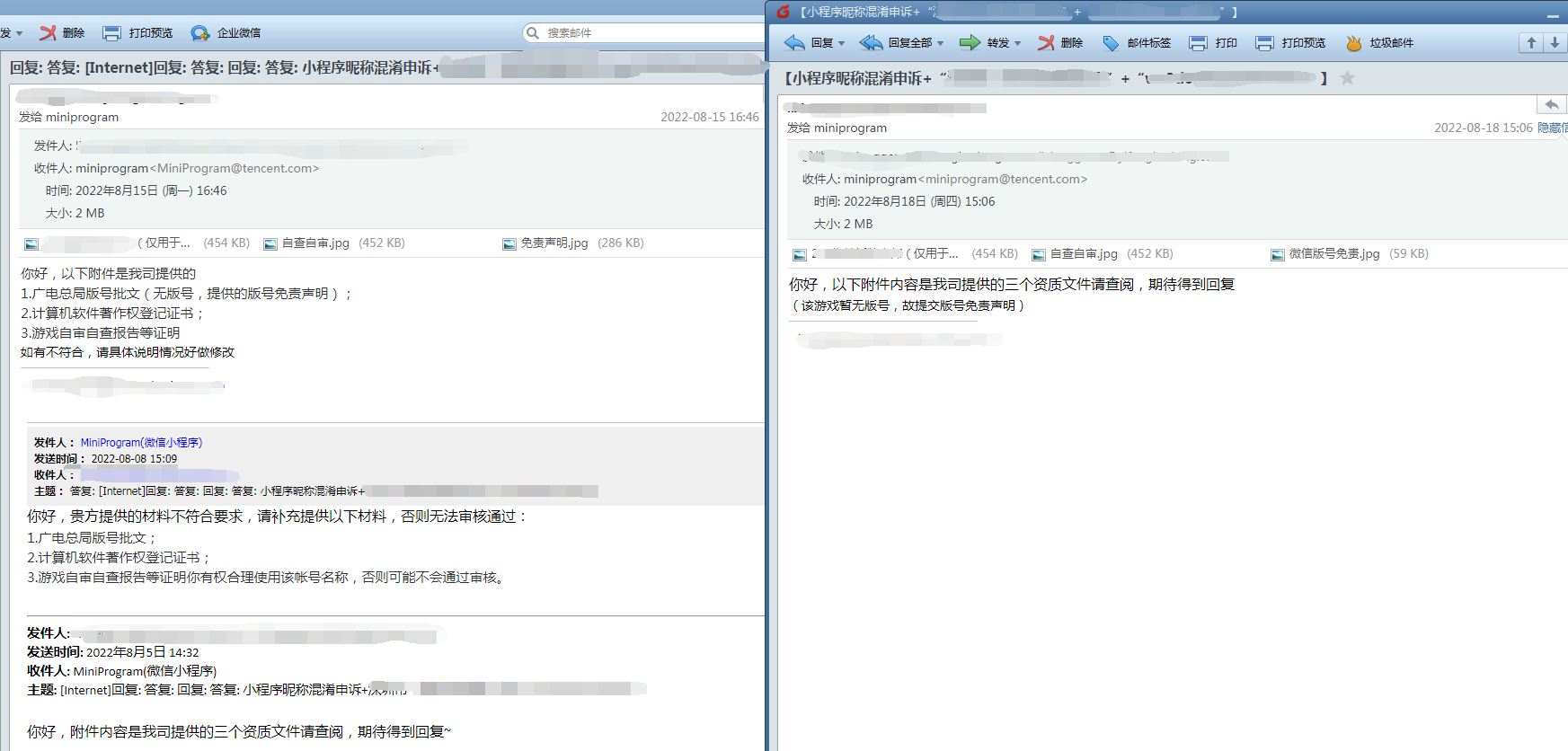 前期因名称混淆问题,游戏名称被清零处罚,现已将需提供的资质材料以附件形式发送至邮件,迟迟未收到回复