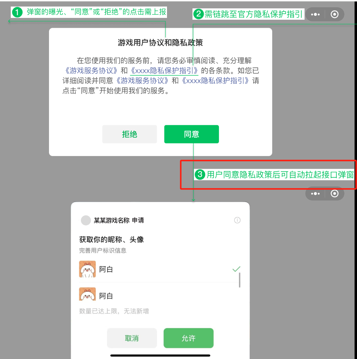 官方说明里,调用隐私协议,用户同意后可自动拉起接口弹窗。这一步是怎么自动拉起的呢?是调用其他隐私接口后才会这样吗?对于小游戏,如果想获得用户头像昵称信息,是不是用户得先同意隐私协议,然后再通过创建createUserInfoButton,用户点击按钮后再进行头像授权后才能拿到头像信息呢?