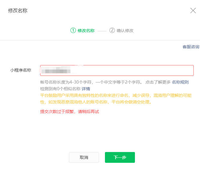 今日11点半左右直接修改名称,还是提醒频繁;现无法改名,但又有整改时限要求,要怎么办?