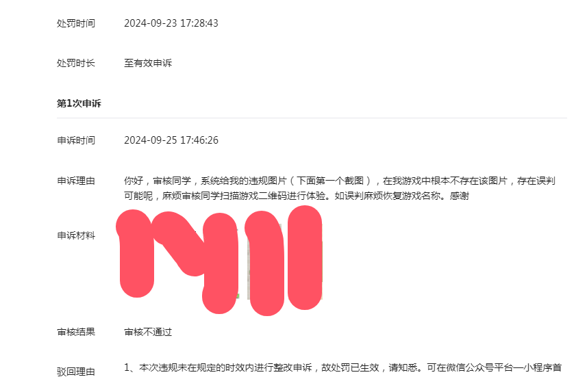 第一次申诉:2024-9-23 因我游戏已暂停,无法验证。