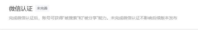 1、【个人】类账号完成微信认证后,将在账号信息介绍页展示微信认证标识,同时可获得被搜索、分享能力;