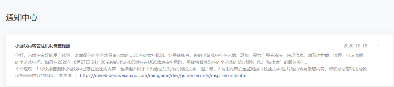 ①世界聊天接了微信的“文本内容安全检测”接口(链接地址:https://developers.weixin.qq.com/minigame/dev/guide/security/msg_security.html)