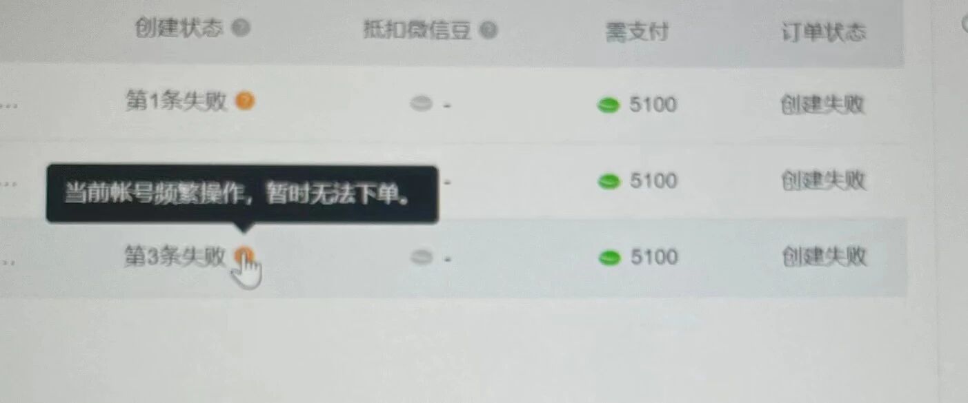 视频号投流账号显示当前帐号频繁操作暂时无法下单 这是什么原因 已经等了2个多小时了
