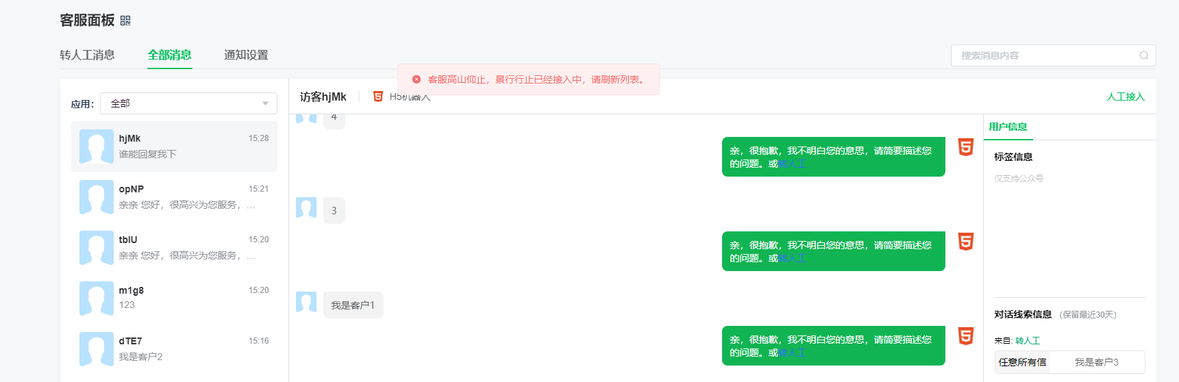 我想测试一下多个用户转人工的情况。测试发现,所有客服都能看到转人工的用户。