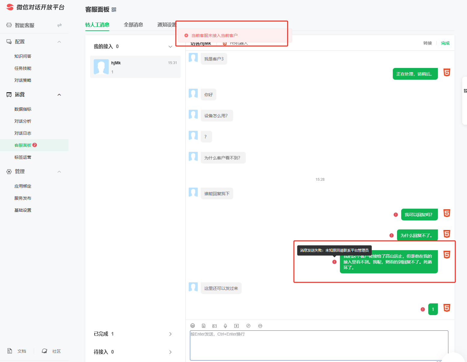 结果转接后,另一个客服发现看不见转接过来的客户。我这边刷新后能看到,但是不能回复。如下图。整个逻辑都乱了。