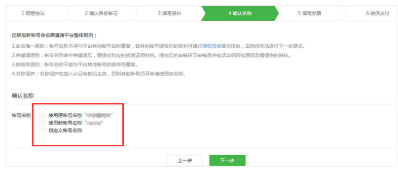 账号迁移时,有三种选择名称方式,其中就包括迁移后使用原名称。