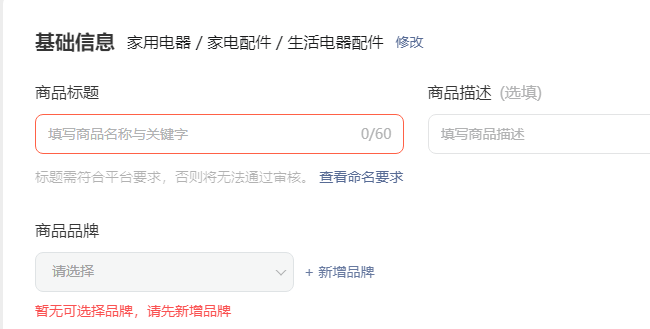 家用电器类-生活电器 类目审核通过, 配件类产品上架 品牌选择不了是什么原因呢