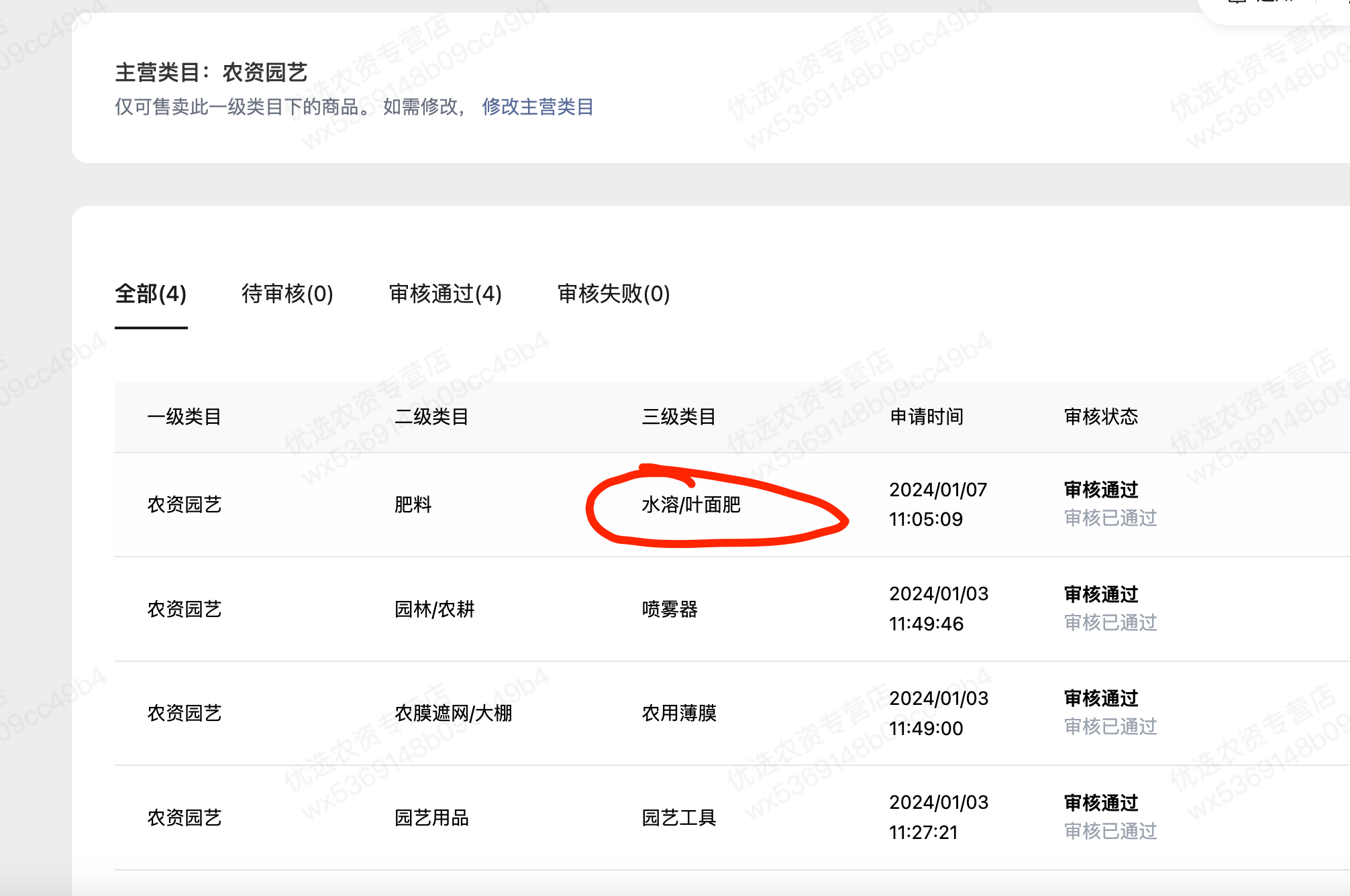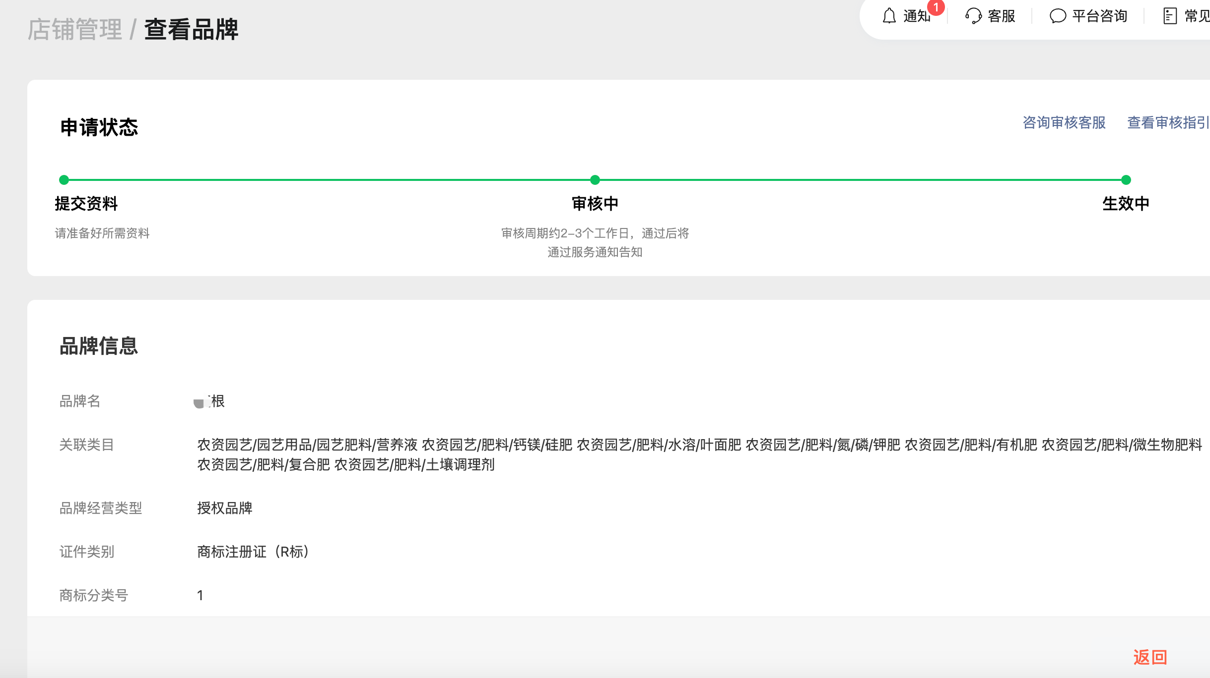如图,申请了农资园艺》肥料类别,而且也通过了