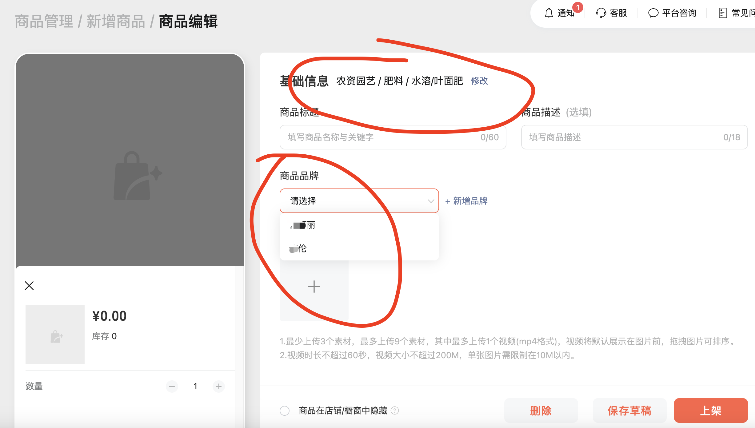 但是新增商品的时候,找不到该商标,只能看到 *丽和*伦,看不到*根的,*丽和*伦原来也不可以,我重新提交了商标审核就行了,*根的删了重新提交也不行
