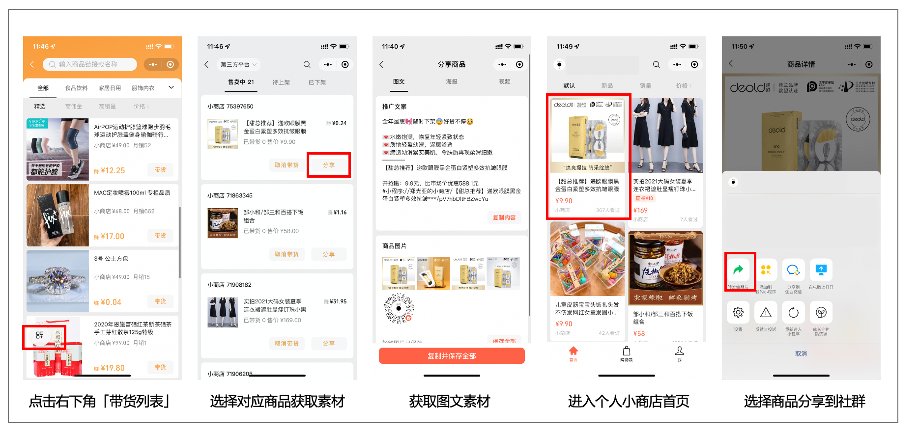 - 在「我要带货」获取相关商品的图文素材,或者将小商店商品转发至社群。(目前移动端仅支持小商店商品获取社群分享素材)