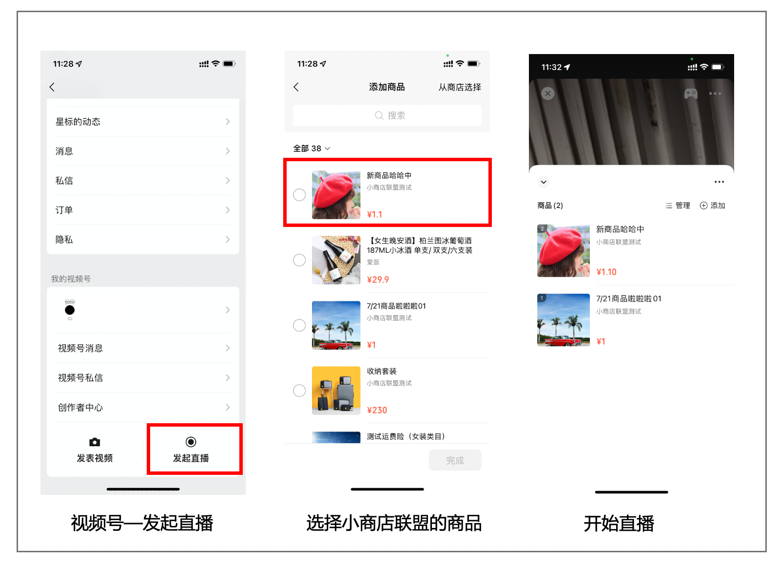 - 发起视频号直播时选择橱窗内联盟的商品。