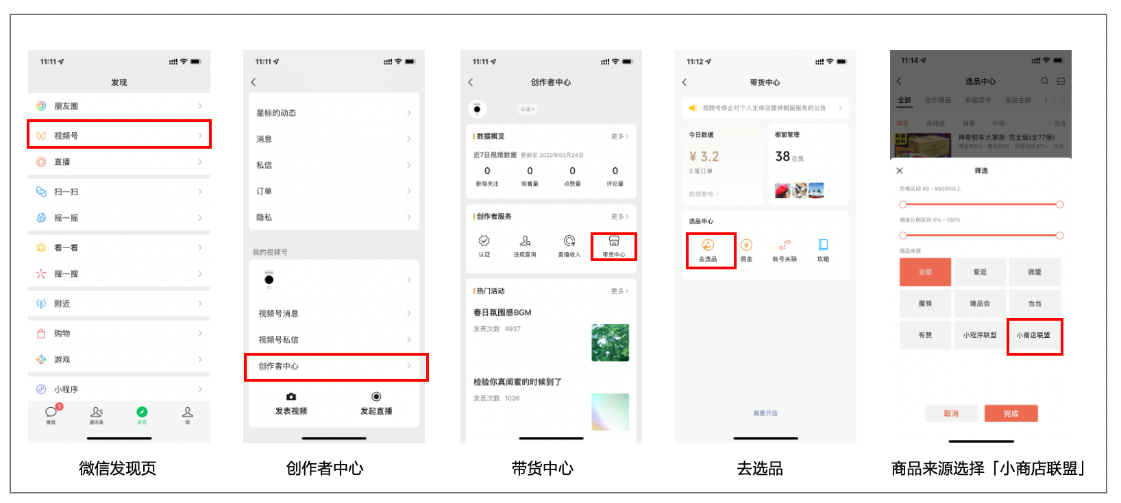 - 在「微信发现页-视频号-创作者中心-带货中心-去选品-选品中心」右上角筛选「小商店联盟」或「小程序联盟」,添加联盟商品至视频号橱窗。