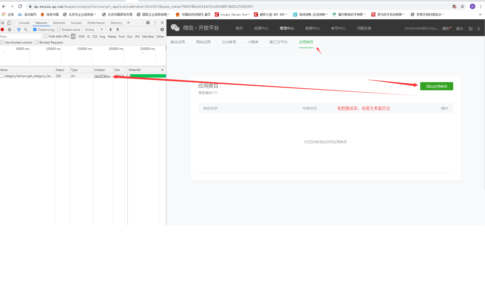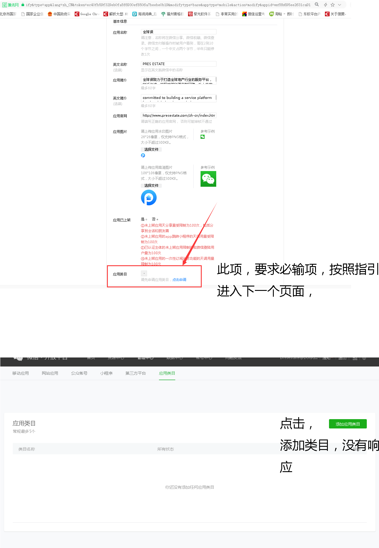 微信开发平台,提交应用审核时,提示要增加应用分类,但是在申请应用分类时,按钮无响应