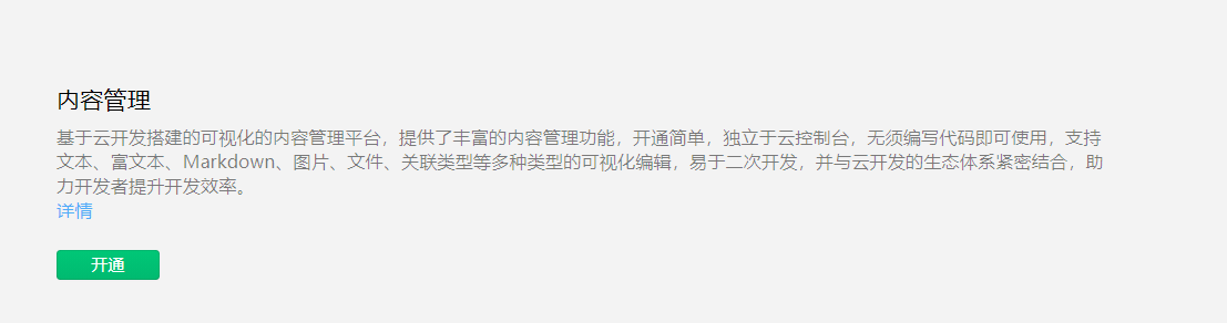 开通内容管理: 小程序/开发/云托管/开发指引/基础能力/云后台/CMS内容管理/开通使用