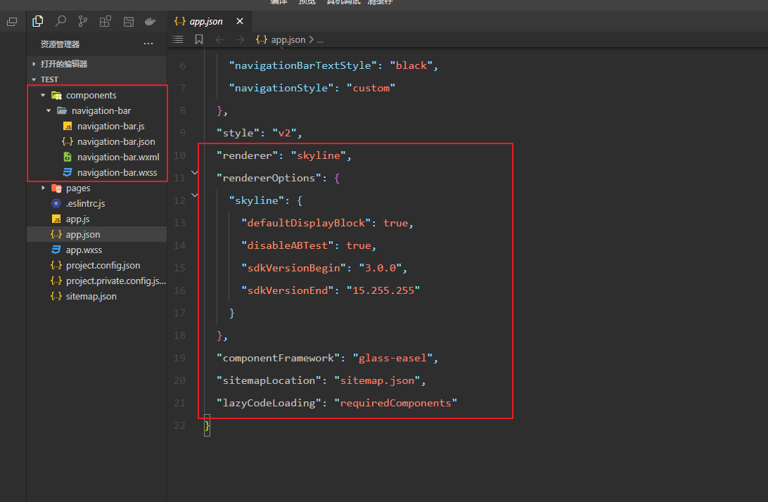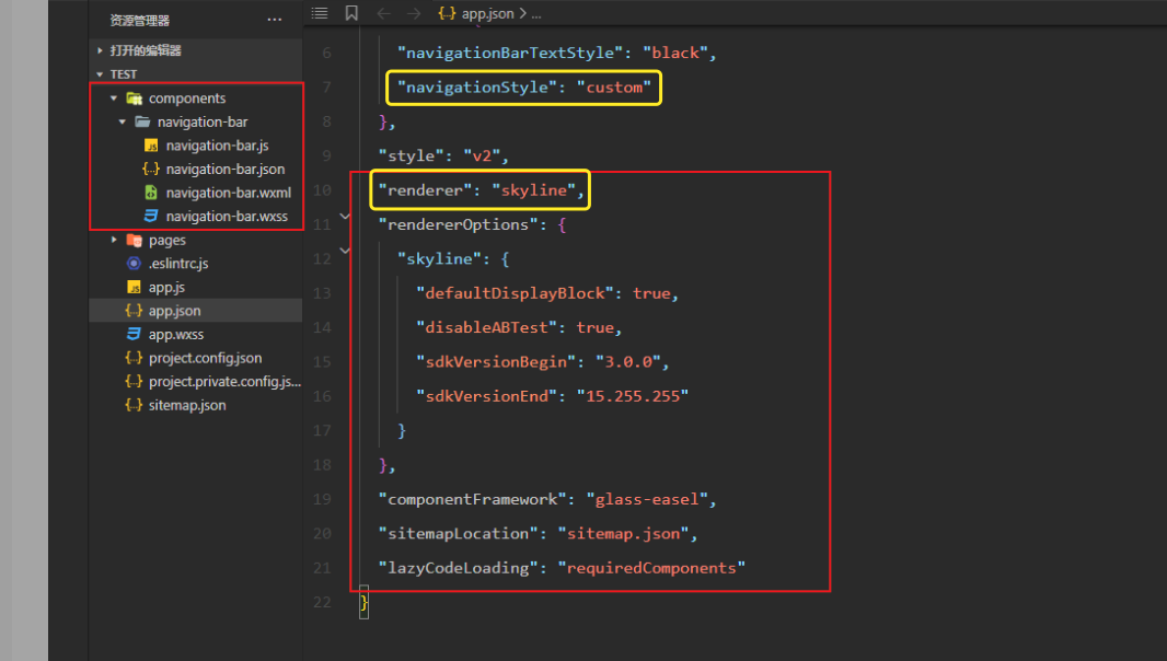 如果你想用回原生导航栏,你可以把 app.json 里面黄色框住的两行代码删除掉,保存后重新编译就可以了。(如果原生导航栏还是不见了,排查下页面配置里面是否有 "navigationStyle": "custom" )