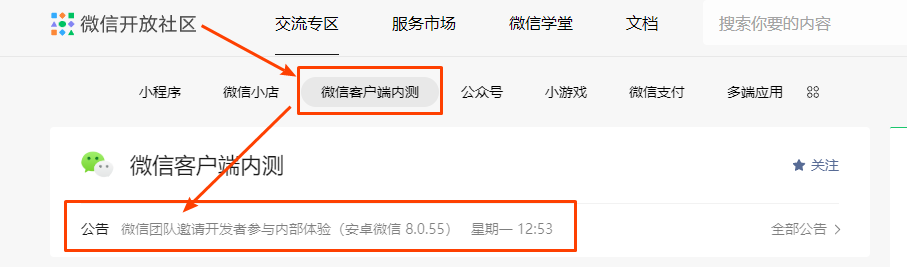 微信开发社区:微信客户端内测(点击公告进入就能查看内测体验详情)