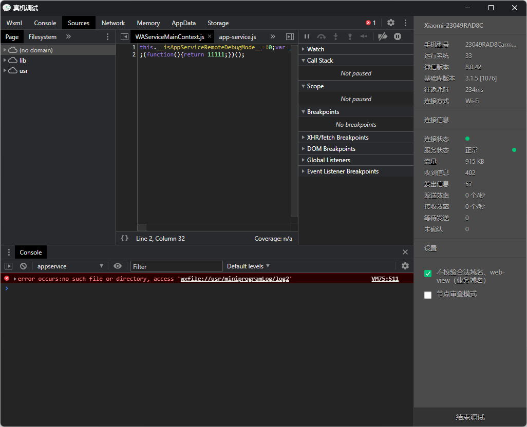 VM75:511 error occurs:no such file or directory, access 'wxfile://usr/miniprogramLog/log2'