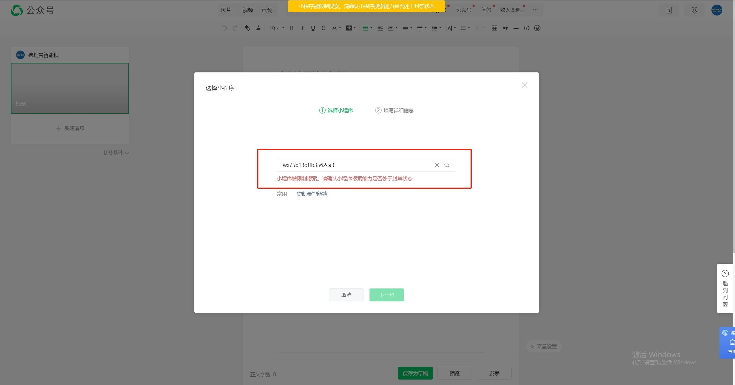 历史打开过小程序的账号就可以正常浏览小程序,但是现在小程序在微信搜索的时候不能搜到,也没办法转发给别人,在公众号发布文章想要链接小程序显示小程序被限制搜索是怎么回事呢?我公众号里面也已经认证通过了,但是点击小程序详情的时候显示小程序未认证,也没有认证入口给我去认证。而且小程序扫码也是正常可以打开的。