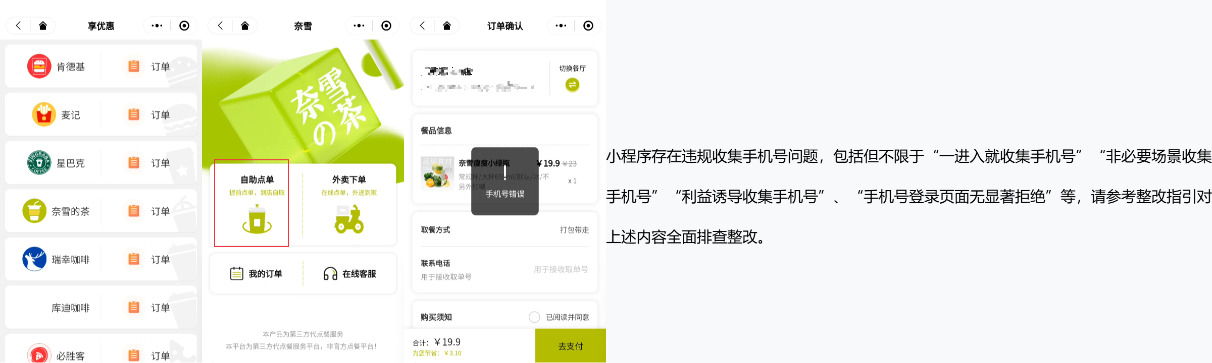 这种违规情况怎么处理? 我小程序授权了第三方插件服务,提供了奈雪的茶点和坑德基,麦当劳等大牌点餐服务。这个用户下单的时候需要填手机号来取餐。可是就是这个填手机号码的这个违规了!请问这种情况我应该怎么申诉才能通过?还是说我需要直接不使用第三方插件?