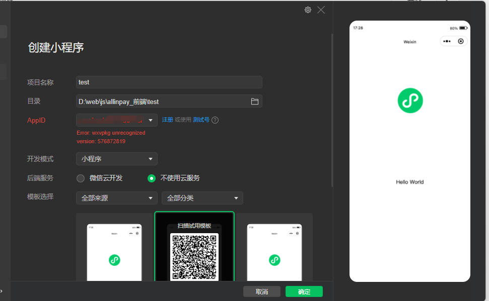 创建小程序的时候报错:
