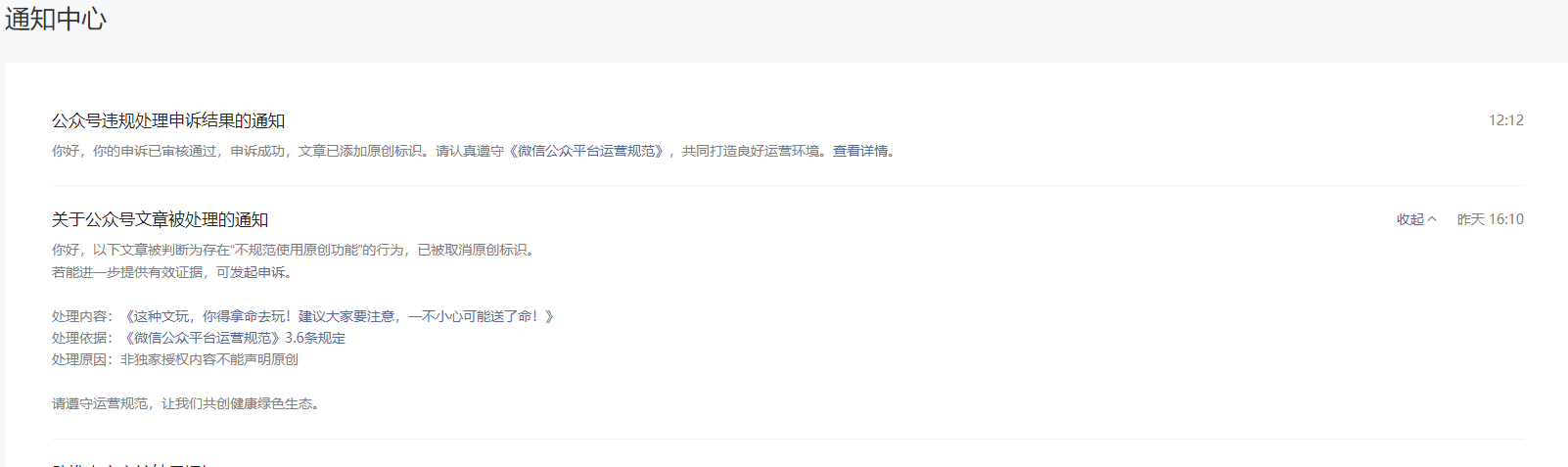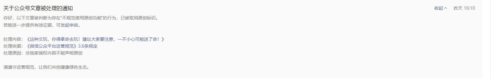 昨天显示违规,原因是我将我本人的头条号首发文章,同步到微信公众号,系统误判成:非独家授权内容不能声明原创。