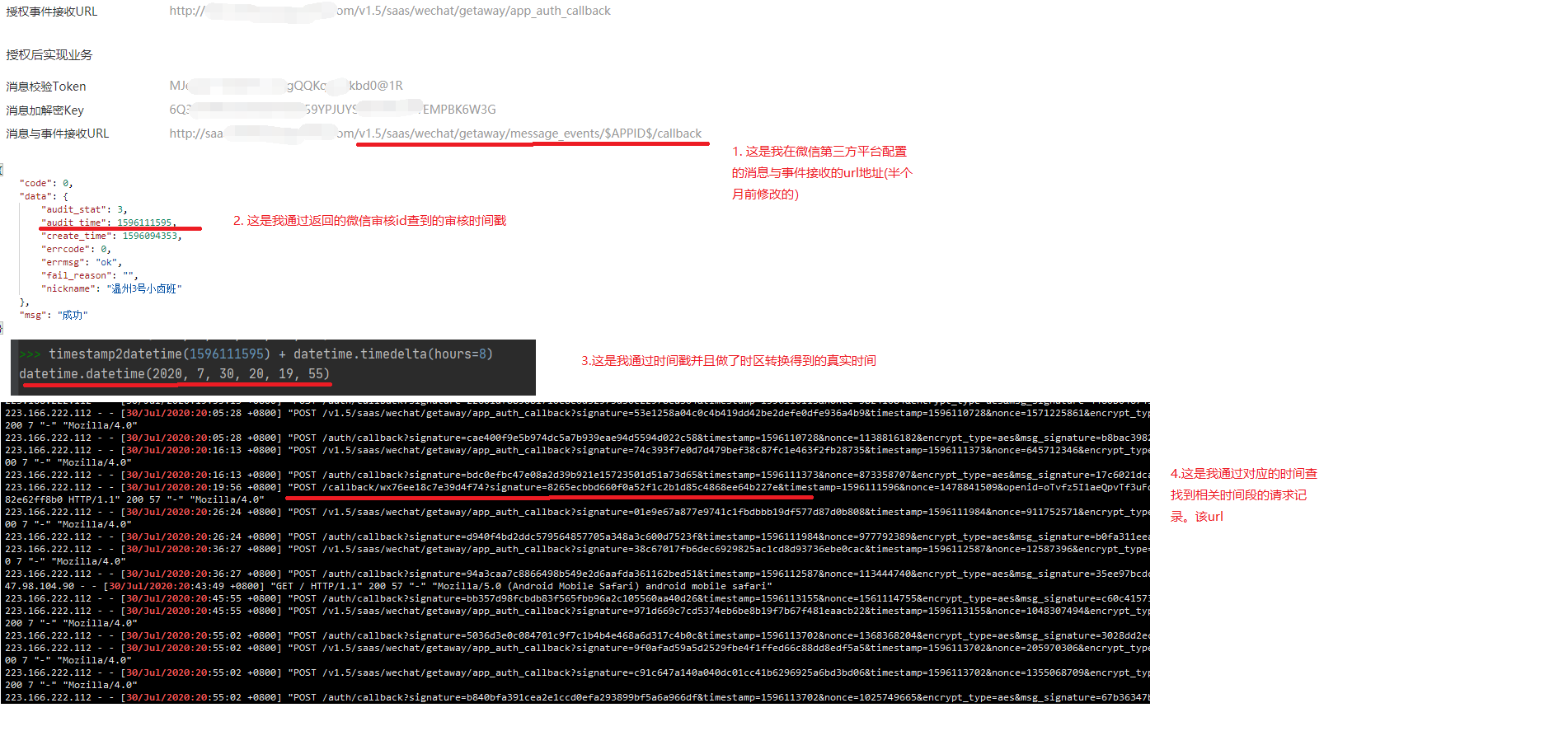 再次修改名称试了一次。根据审核事件查到我们服务后台的请求记录了。说明开发的saas后台确实是收到了该请求。只是url跟我们saas后台配置的url并不一致。我觉得可能是第三方平台的配置设置失效了。