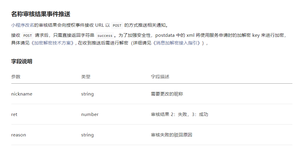 这个是名称修改后事件接收入口,说是会向授权事件接收 URL发送密文。实际上我没有收到。你说的该url是小程序的url配置,我这边是做第三方应用开发的,文档上没有看见可以对小程序配置事件接收api。