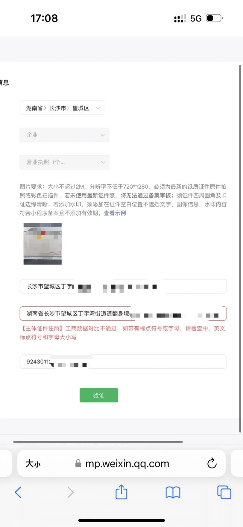 小程序备案主体证件住所工商数据对比不通过怎么解决