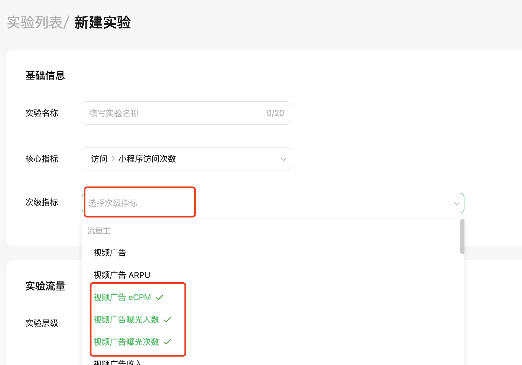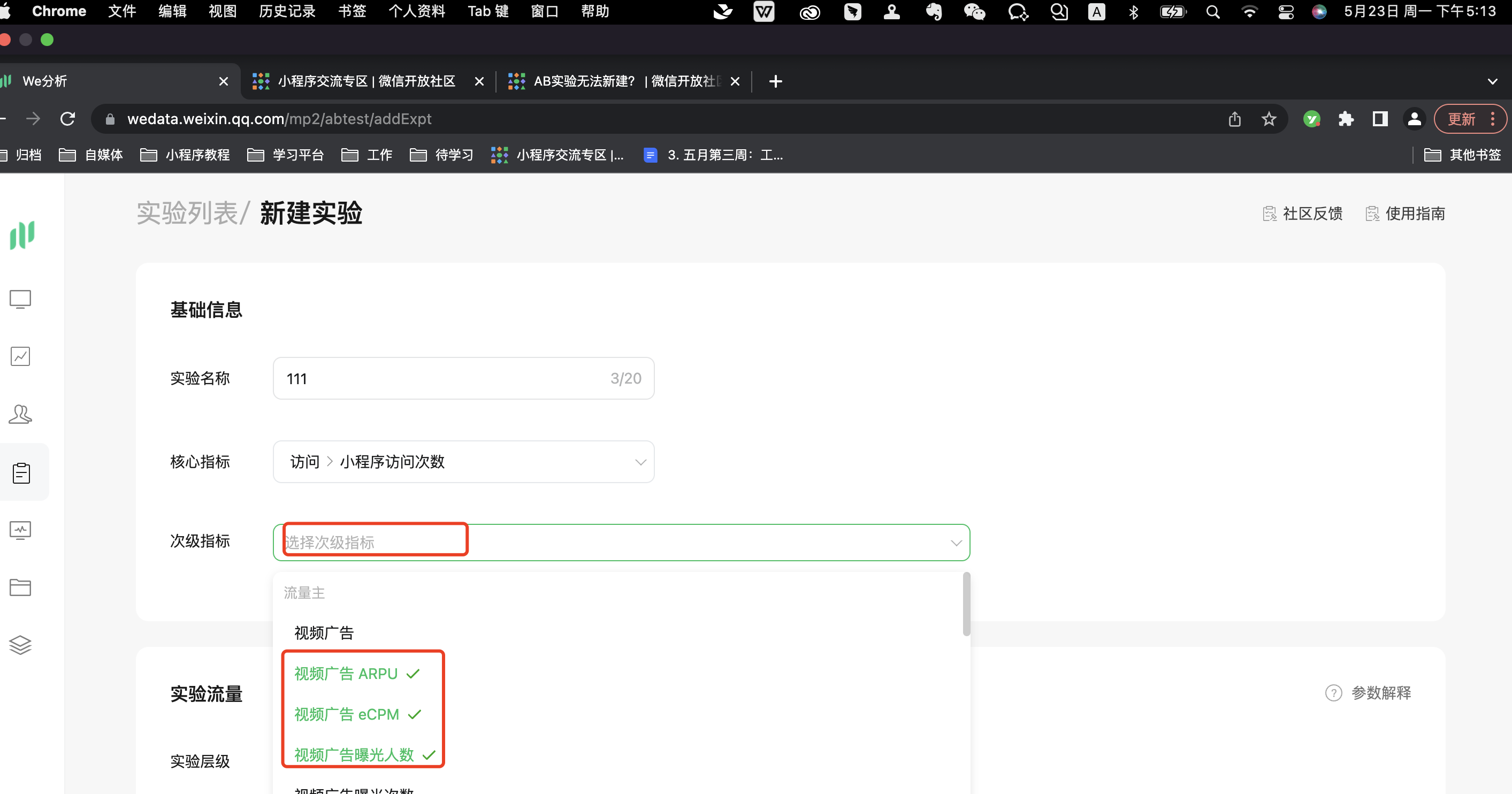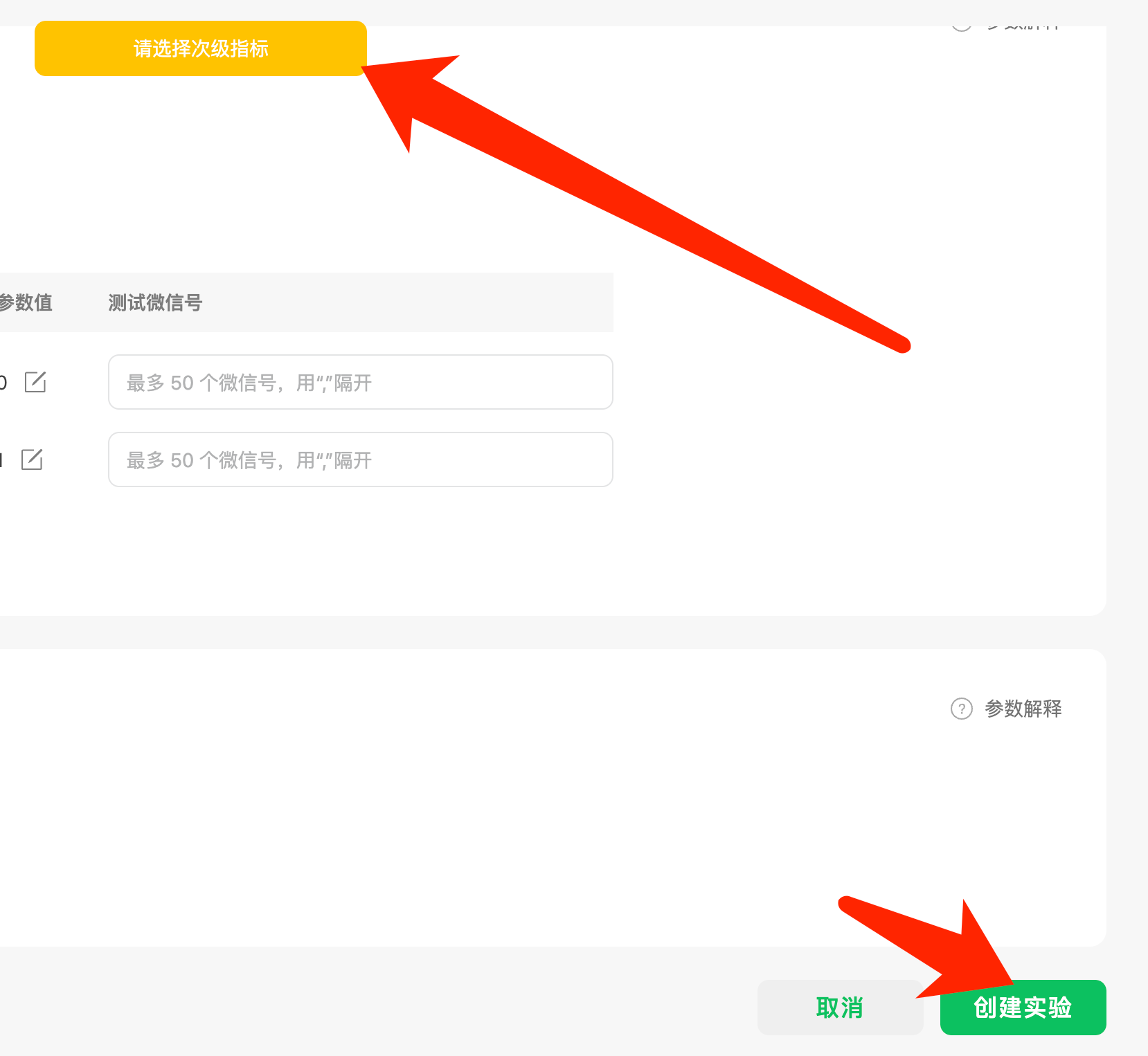 操作路径:新建实验=》选择次级指标(无法选择成功)=〉点击创建实验=》提示选择次级指标