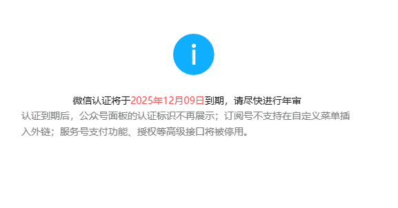 认证过期,不影响账号发表内容,就是认证标识、部分高级接口权限(例如服务号网页授权、服务号发起支付、群发/发布接口等等)没有了。