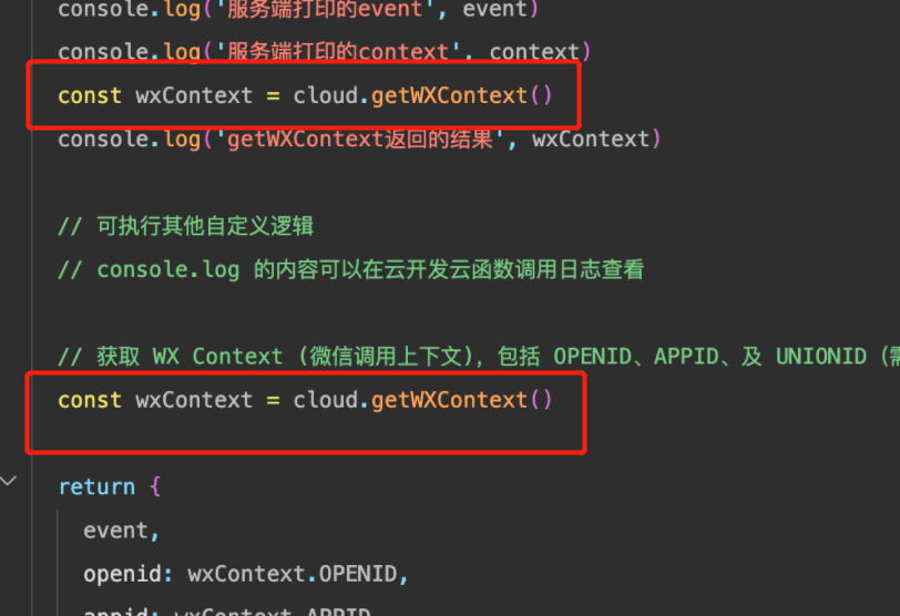 {"errorCode":-1,"errorMessage":"Runtime.UserCodeSyntaxError: SyntaxError: Identifier 'wxContext' has already been declared\n at Object.module.exports.load (/var/runtime/node10/UserFunction.js:33:13)\n at Runtime.handleOnce (/var/runtime/node10/Runtime.engine.js:95:38)\n at Timeout.setTimeout [as _onTimeout] (/var/runtime/node10/Runtime.engine.js:54:12)\n at ontimeout (timers.js:436:11)\n at tryOnTimeout (timers.js:300:5)\n at listOnTimeout (timers.js:263:5)\n at Timer.processTimers (timers.js:223:10)","statusCode":443}