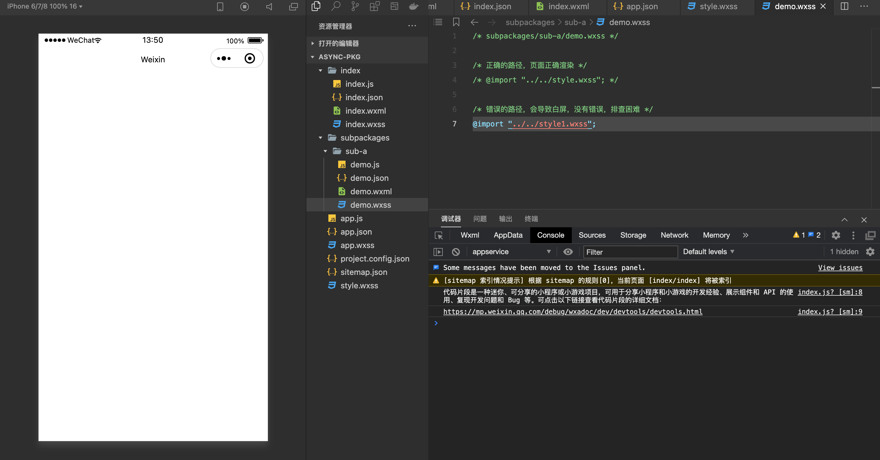 在开发者工具中,在主包的页面中引入异步分包的组件时,如果组件引入错误的wxss地址时,将会显示白屏,且控制台没有任何错误,只有预览时才会提示未找到对应文件,这提升了排查问题的成本,希望能改进