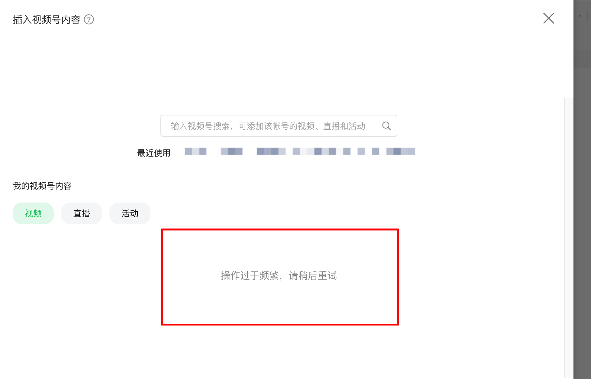 微信公众号插入视频号,提示“操作过于频繁,请稍后重试” ,过了一天都用不了。