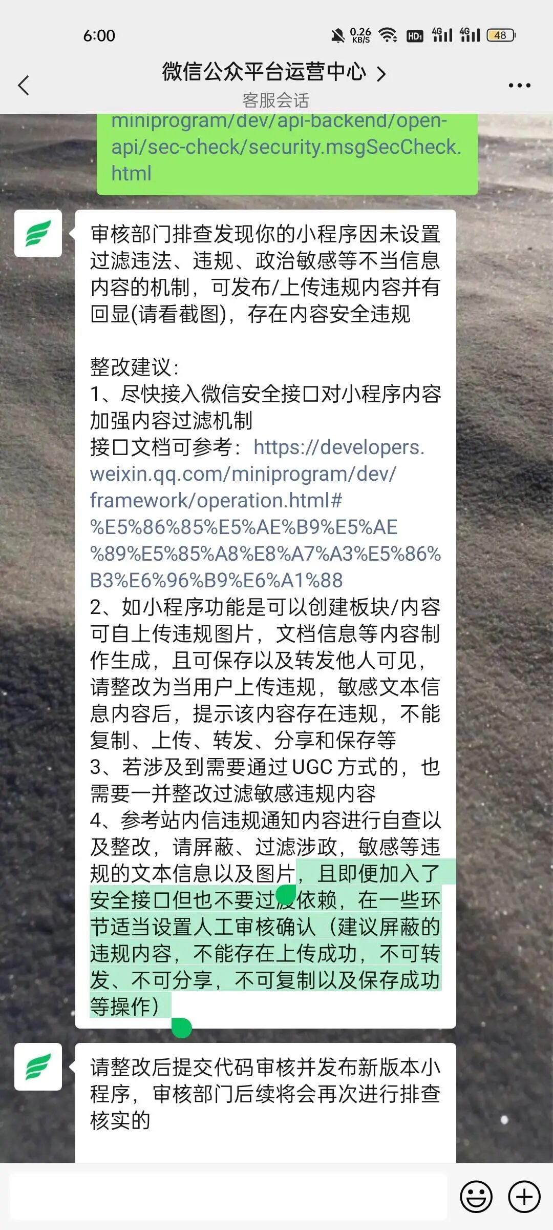 我已经接入了微信的相关msgSecCheck接口,但什么都检测不出来,并且客服回复如图,我不可能雇人去专门看这些吧,问你们,你们就是:“这不关我们的事”