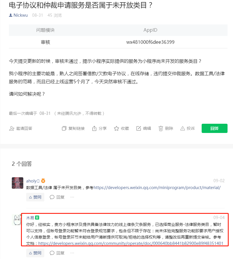 后来导致小程序也无法审核通过,说是涉及未开放目录,我们在小程序交流区咨询了官方,官方回复查看我们小程序后没有类目问题,请重新提交审核
