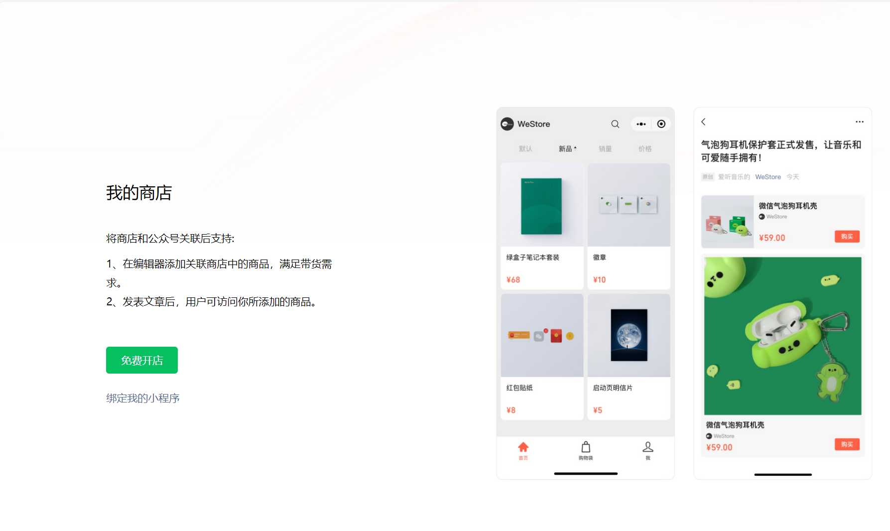 关联小商店:点击我的商店,进入后是:免费开店和绑定我的小程序,难道不支持“微信小商店了吗”,如何绑定微信小商店呢?天啦,以前都是在写文章的时候可以显示“我的商品”,直接就选择小商店的商品卡片,现在不行了呀,请问是方式变了吗?官