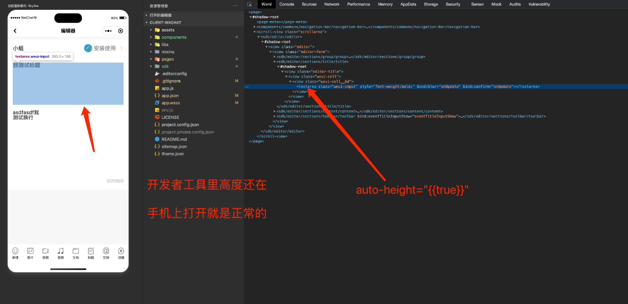 2、textarea 组件已经开启 auto-height,此时 style.height 应该失效,但是在开发者工具里还是有效,并且怎么定义都没用,就是低不下来,一直这么高占位。手机上预览是正常的,开发者工具不行。Nightly Build 1.06.2404302