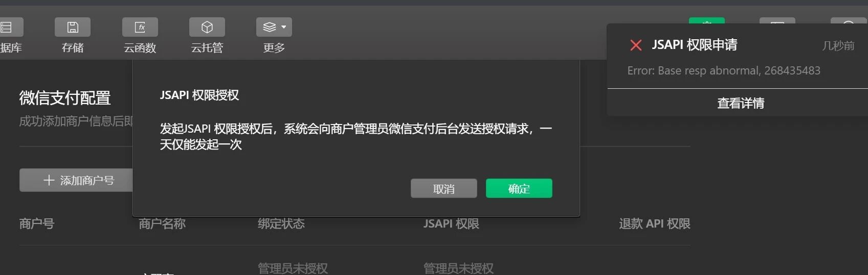 小程序已经绑定商户号,而且商户号正常,其中一个正在进行店铺收款二维码。但是在云开发中提示“绑定状态”和“JSAPI 权限”管理员未授权。