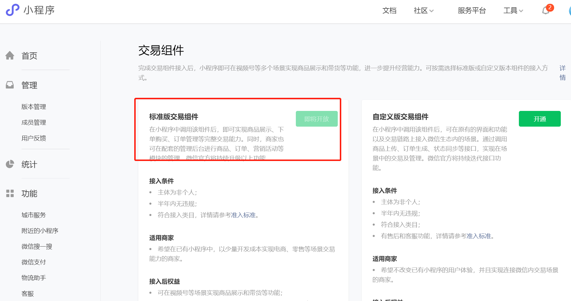我的接入条件全部满足了,为什么显示即将开放,我不开通自定义,我要开通标准版?
